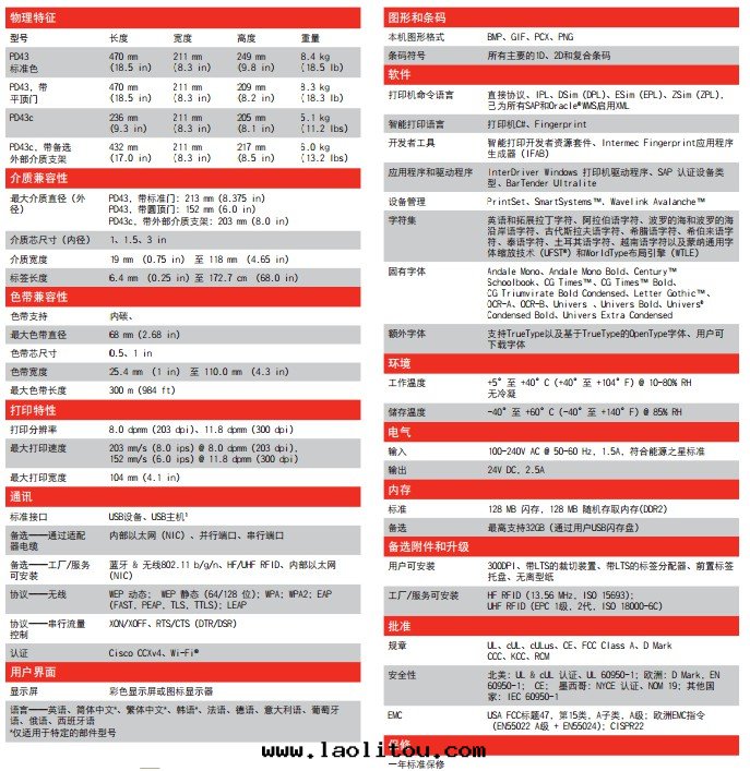 intermec PD43/PD43C条(tiáo)碼打(dǎ)印(yìn)機(jī)産品規格: