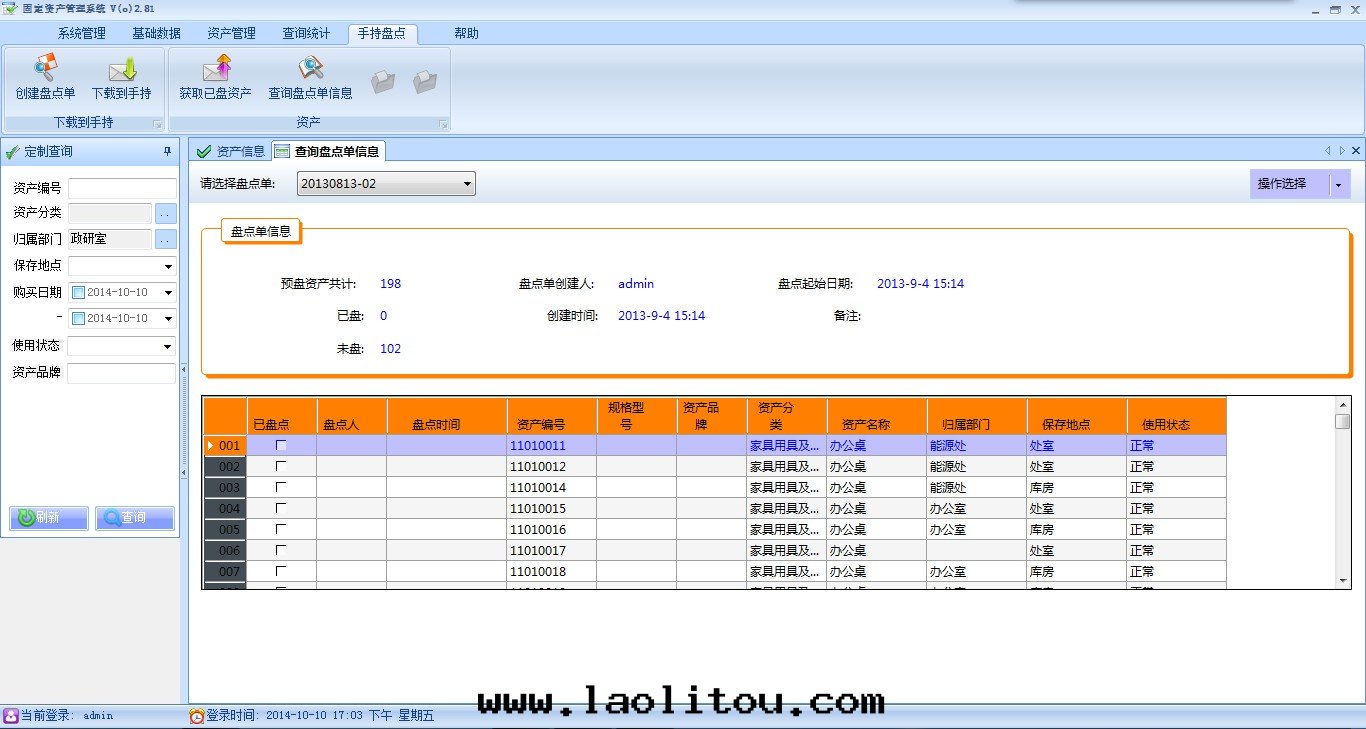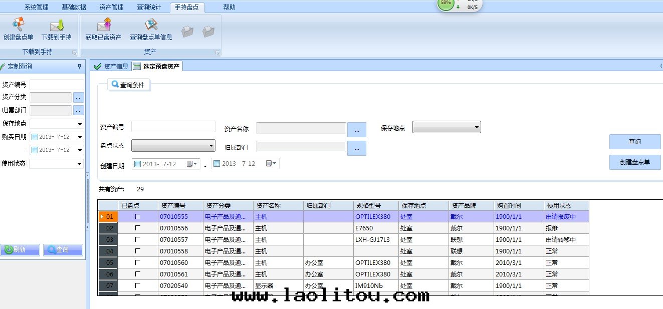 資産盤點(diǎn)的(de)邏輯:創建盤點(diǎn)單->将盤點(diǎn)單下(xià)载(zài)到(dào)手(shǒu)持(chí)上(shàng)->手(shǒu)持(chí)開(kāi)始(shǐ)盤點(diǎn),盤點(diǎn)完成(chéng)後(hòu)将盤點(diǎn)單上(shàng)傳到(dào)PC系(xì)統中(zhōng)->導出(chū)盤點(diǎn)信(xìn)息。