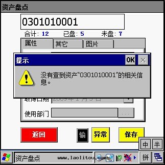 l 对(duì)于(yú)手(shǒu)持(chí)中(zhōng)不存在(zài)的(de)資産,系(xì)統将弹出(chū)如(rú)下(xià)图(tú)提(tí)示信(xìn)息。如(rú)果(guǒ)确認該資産尚未录(lù)入(rù)資産管(guǎn)理(lǐ)系(xì)統中(zhōng),用(yòng)戶可(kě)以(yǐ)使用(yòng)手(shǒu)持(chí)的(de)現(xiàn)场(chǎng)抄号(hào)功能将該資産臨时(shí)記(jì)录(lù)下(xià)来(lái),然後(hòu)利用(yòng)PC機(jī)上(shàng)的(de)抄号(hào)導出(chū)功能記(jì)录(lù)到(dào)Excel表(biǎo)格中(zhōng)。